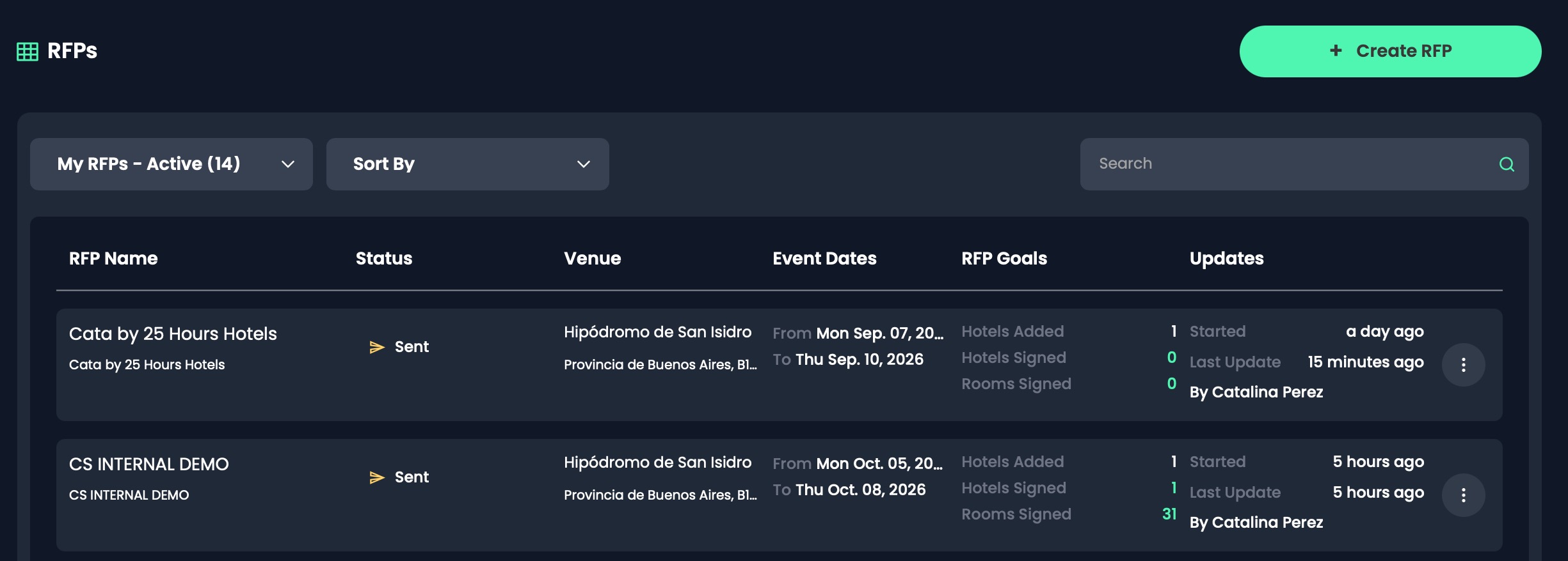 Sent RFPs: Displays "Sent" once the RFP has been sent to the hotel.