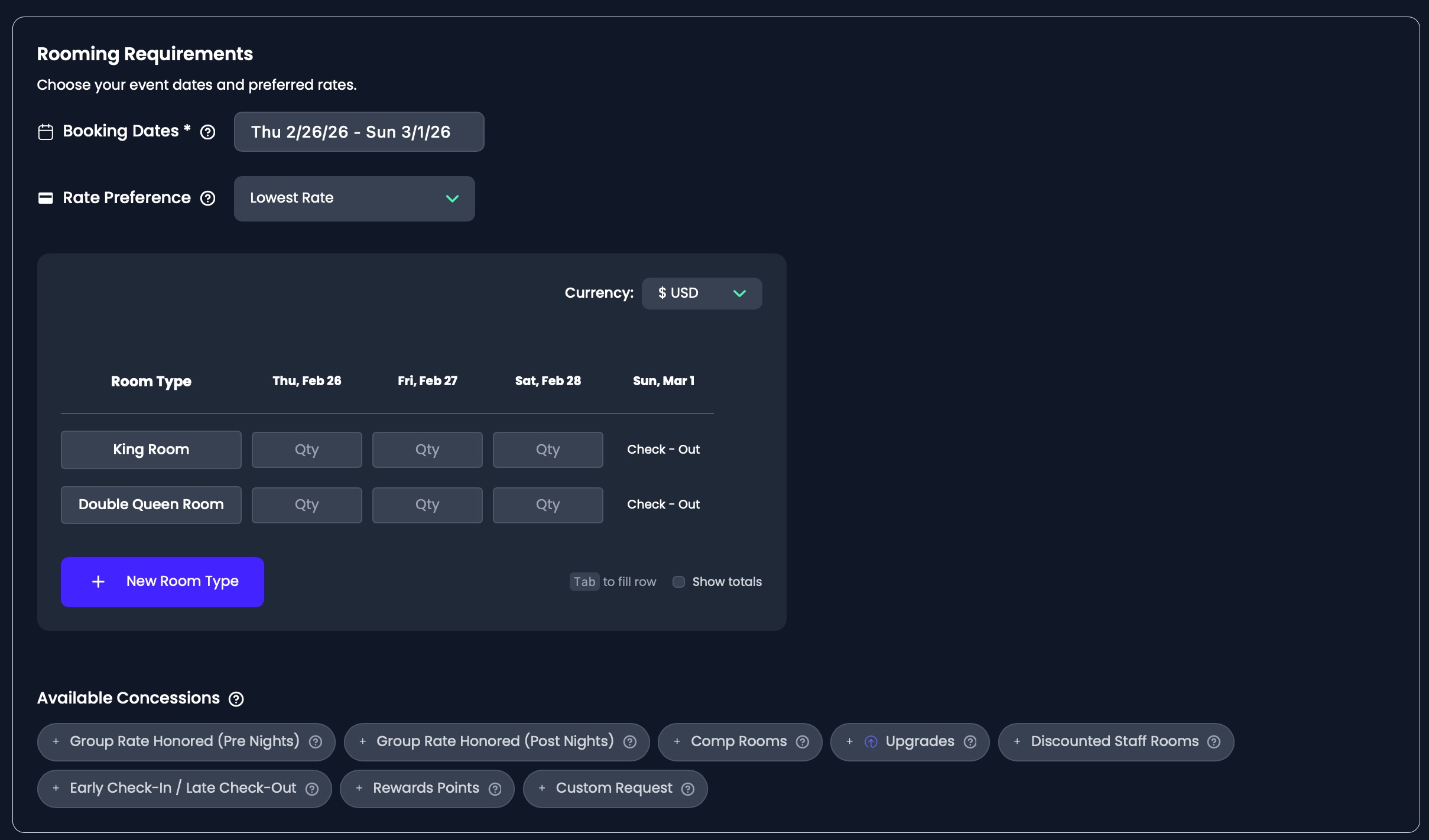 - Comp Rooms: Complimentary rooms the hotel provides based on a certain number of rooms booked.